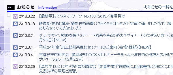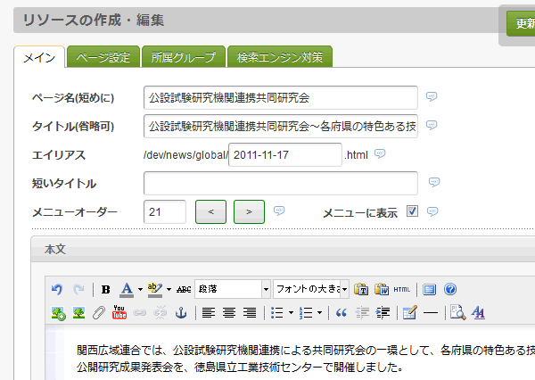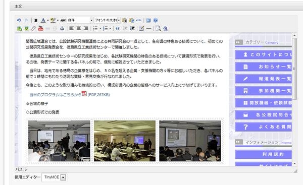 お知らせ記事は通常の投稿操作以外に、各公設試サイトが提供しているRSSフィードから情報を取得して自動的に合成できるようにしています。タイトルをクリックすると、各公設試サイトの該当ページを直接開きます。RSS連動型のコンテンツは通常はRSSパーサを用いて自動展開を行なうことが多いですが、当案件ではリソースとして実際に投稿しますので、後から必要に応じて任意に変更を加えることができます。