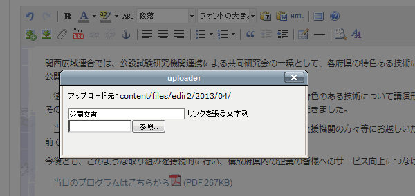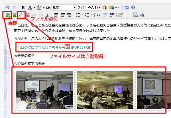 PDF・Word・Excelなどの文書ファイルもワンタッチで添付できます。ファイル選択と同時にアイコン付きのリンク文字列を生成するところまで自動的に行います。ファイルサイズも自動的に挿入します。