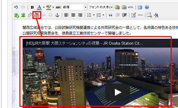 Youtube動画も簡単に貼り付けられます。TinyMCE標準の動画貼り付け機能と違い、投稿画面内で動画をプレビューできるため分かりやすいです。