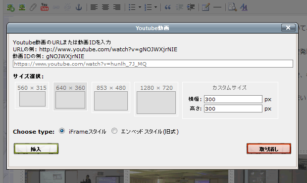 動画のURLを貼り付けて挿入ボタンをクリックするだけです。