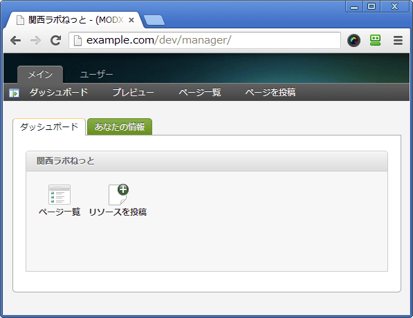 投稿担当者のアカウントでログインした場合は、シンプルな管理画面を表示します。MODXの特長であるリソースツリーも表示されません。これなら迷わず操作できます。
