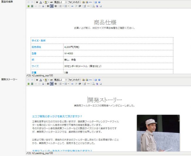 各部を必要に応じて書き換えるだけでよいため、ページ編集を簡略化できます。各部をフォームに分ける(タイトル・本文・写真など)こともできますが、表現が画一的に揃えられて単調になりがちですし、実際にどう表示されるのかが直感的に分かりにくくなるため、このような単純な方法が現場の担当者様には扱いやすいです。投稿画面のスタイルは実際のサイトと合わせました。